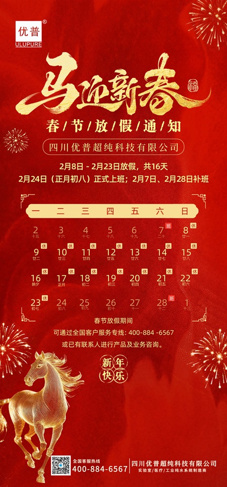 公司定于2026年2月8日-2月23日放假,2月24日(正月初八)全体员工正常上班,2月7日、2月28日补班。春节放假期间,可通过全国客户服务专线: 400-884 -6567或已有联系人进行产品及业务咨询。